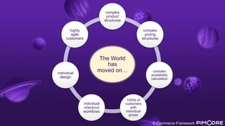 The e-commerce framework provides a component-based architecture for developers to build e-commerce solutions with outstanding native integration into Pimcore. It has been developed and improved over 5 years as a Pimcore plugin and integrated into Pimcore's core distribution. The framework targets businesses that need agility for presenting unique products and services with complex structures in the digital world. It provides architecture, services, and best practices while allowing flexibility for customization. The modules include capabilities for filtering, indexing, pricing, carts, orders, payments, and checkouts.