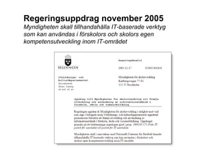 Regeringsuppdrag november 2005Myndigheten skall tillhandahålla IT-baserade verktyg som kan användas i förskolors och skolors egen kompetensutveckling inom IT-området