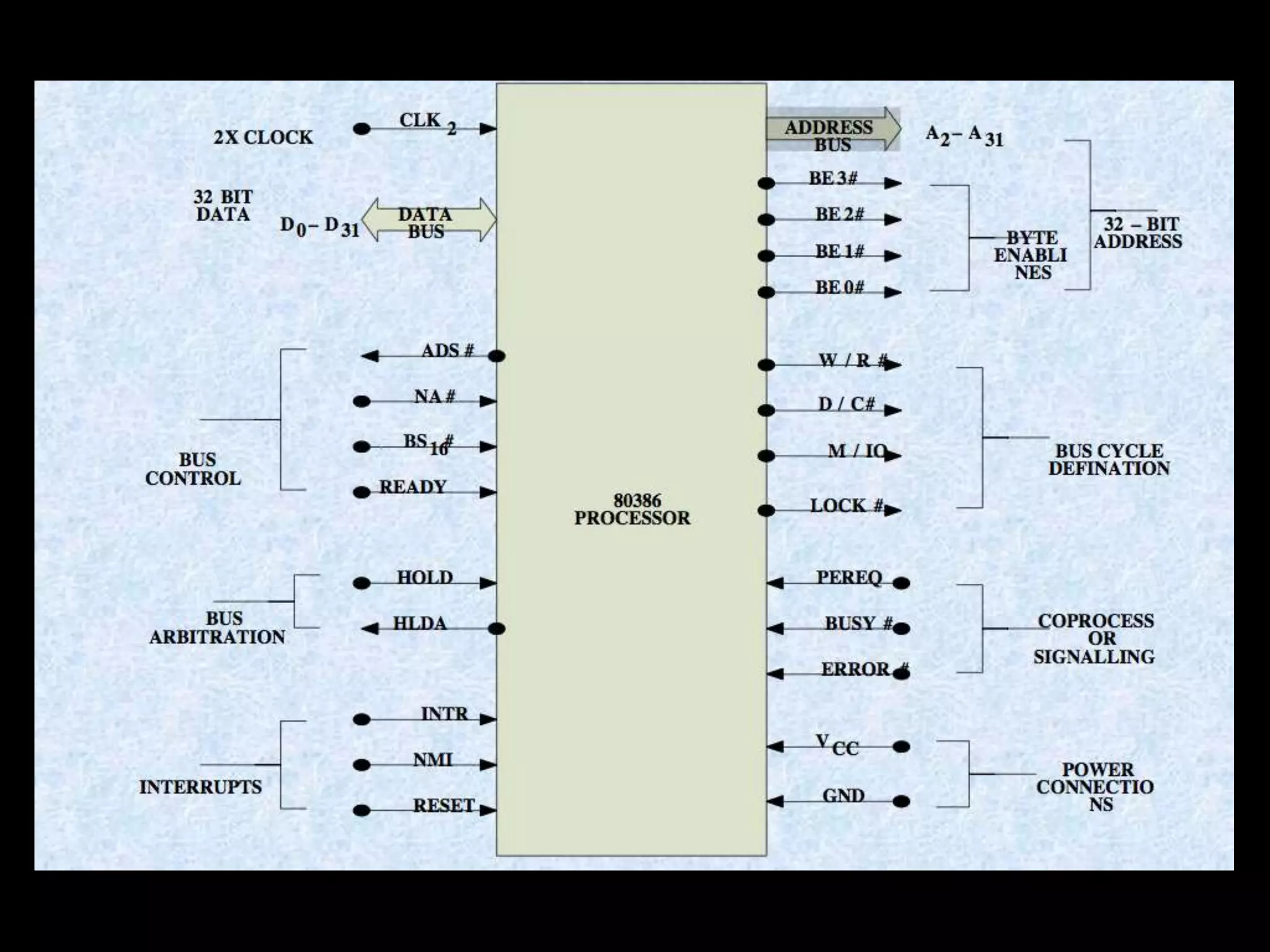 The document provides a detailed overview of the 80386DX microprocessor architecture, outlining its pin configurations, memory addressing capabilities, and various bus operations. It explains the functions of different pins related to data transfer, interrupts, bus arbitration, and coprocessor signaling. Additionally, the document includes references for further reading on the 80386 and 80486 microprocessors.