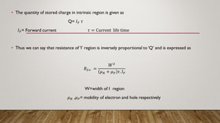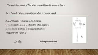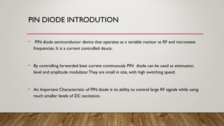 PIN diodes are semiconductor devices that can act as variable resistors at radio and microwave frequencies. They are controlled by forward bias current and can be used as attenuators, modulators, and switches. PIN diodes have a P-type semiconductor, an intrinsic semiconductor, and an N-type semiconductor sandwiched together. When forward biased, PIN diodes have a gradual increase in current flow through the intrinsic region, giving a variation in resistance. This property allows them to be used to control large RF signals with smaller DC excitation. Common applications of PIN diodes include RF switching, attenuation, and modulation.