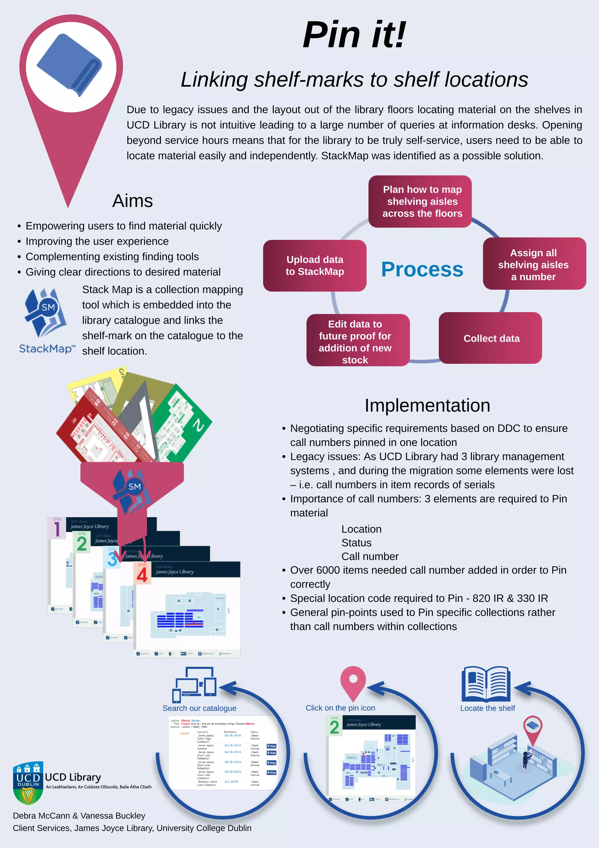 The document discusses the challenges of locating materials in the UCD library due to legacy issues and non-intuitive shelving layouts, leading to frequent queries at information desks. To enhance user experience and promote self-service, StackMap is proposed as a solution to link shelf-marks to their actual locations. The implementation involves addressing call number discrepancies, pinning over 6000 items, and planning for future inventory additions.