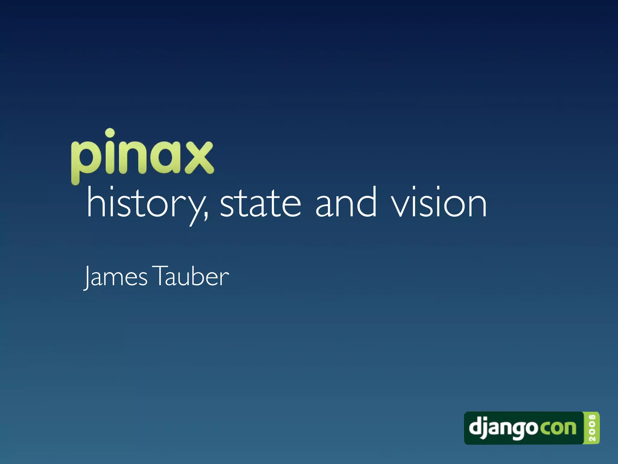 This document discusses Pinax, an open source platform for building community websites with Django. It provides a collection of reusable apps, conventions for developing apps, and starting points for new projects. The document outlines the history and development of Pinax over time, including adding new features to its reusable apps and the structure of its code repositories.