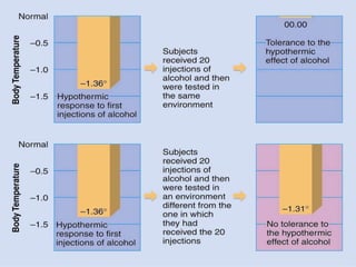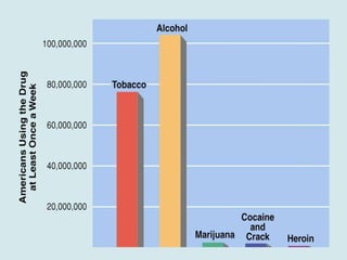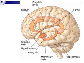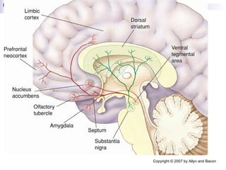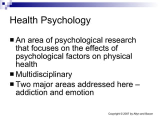 Health psychology focuses on how psychological factors impact physical health. Addiction involves tolerance, dependence, and continued use despite consequences. The brain's dopamine system is involved in addiction, signaling reward and craving. Chronic stress can impair immune function and increase disease risk by activating stress responses. Emotions involve the amygdala and other brain regions, and fear conditioning demonstrates the amygdala's role in processing fearful stimuli.