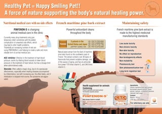 The document discusses the benefits of Pinfenon-S, a revolutionary animal medical care treatment that enhances the body's natural healing and has no side effects. It highlights the advantages of French maritime pine bark extract as a powerful antioxidant with multiple health benefits, including its effectiveness in preventing oxidative damage. Additionally, it outlines safe dosage guidelines for a health supplement containing this extract and other ingredients for animals based on their weight.