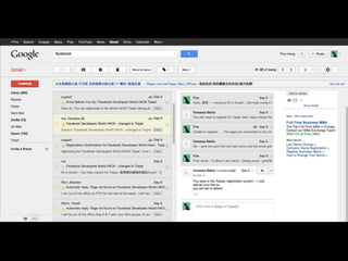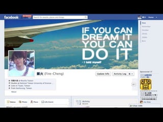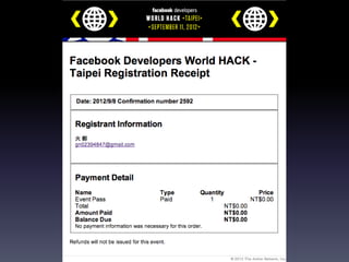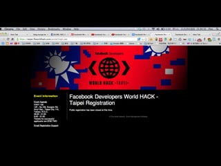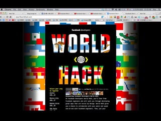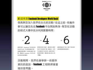 该文档记录了2012年11月29日在台大博理馆举行的Facebook World Hack官方延伸活动,团队分享了他们的经验。参与者包括信息管理系的学生郑有顺与郑火,他们讨论了黑客精神及其在不同领域的应用。活动中还涉及了创业、网络社群和技术工具等主题。