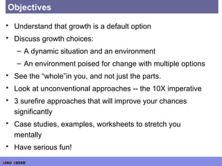 The document outlines an agenda for a growth acceleration workshop. The key objectives are to understand growth as a default option, discuss various growth choices and approaches, and examine case studies and examples. The agenda includes an introduction, discussion of growth architecture and application through a case study. Unconventional approaches and successful management techniques will also be discussed. The workshop format aims to be informal yet structured, with open discussion and flexibility to change emphasis.