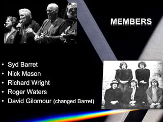 Pink Floyd was an influential English rock band known for their progressive and psychedelic music, philosophical lyrics, and elaborate live shows. They had great commercial success and musical impact. The band was originally founded by Syd Barrett, who was the initial lead singer and guitarist but left in 1968 due possibly to mental health issues exacerbated by drug use. One of Pink Floyd's most famous and commercially successful albums was 1979's The Wall, a rock opera that was later adapted into a feature film and performed live with theatrical elements.