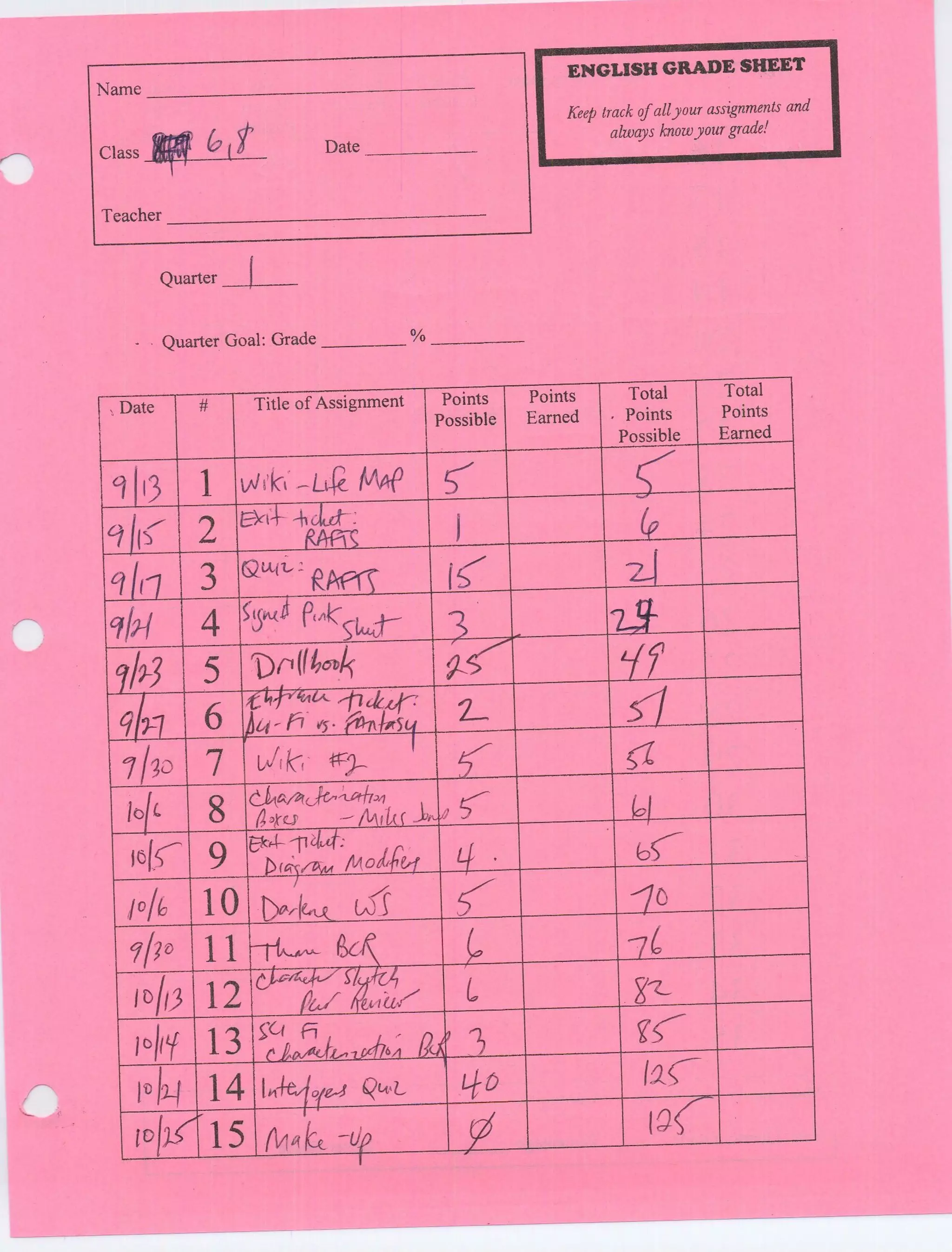 English grade sheet
