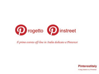 Il progetto Pinstreet è il primo evento offline in Italia dedicato a Pinterest, un social network per la condivisione di immagini e video. L'evento mira a diffondere la conoscenza di Pinterest tra le piccole e medie imprese e si svolgerà dal 1 al 7 ottobre 2012, con attività per negozianti e la creazione di bacheche tematiche. Pinterest si sta rapidamente diffondendo in Italia, rappresentando un'ottima opportunità per far conoscere e vendere prodotti in modo creativo.