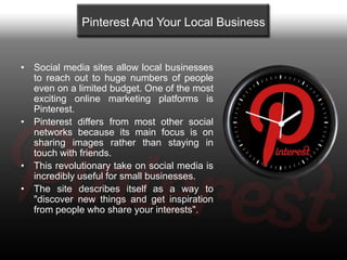 Pinterest is a social media platform focused on sharing images. It allows businesses to showcase their products and services through visual pins to reach a large audience. To leverage Pinterest for marketing, businesses should create appealing pinboards, build followers through competitions and external pins, and link pins back to their website for traffic and potential sales. With a successful Pinterest strategy, businesses can see benefits like increased sales, brand awareness, and understanding of their target market.