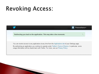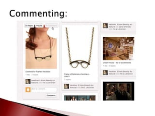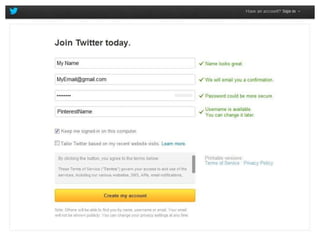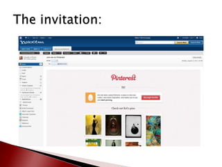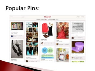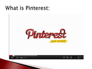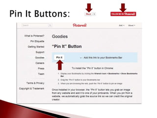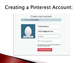 This document provides an overview of Pinterest and how to create an account. It defines key Pinterest terms like boards, pins, repins, followers, and following. It describes the basic functionality of adding pins from websites or uploading personal content. Finally, it provides resources for learning more about Pinterest including making an appointment with the library for one-on-one assistance in setting up an account.