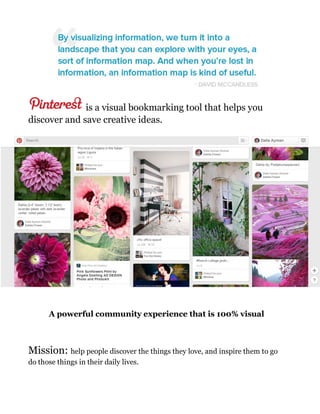 Pinterest is a visual bookmarking tool that allows users to discover and save creative ideas, focusing on community engagement through visual imagery and organized projects. The platform emphasizes user experience by offering frictionless navigation, social sharing capabilities, and personalized recommendations, catering to users' creative needs. Suggestions for improvement include making logout settings more accessible and enhancing pin visibility on boards.