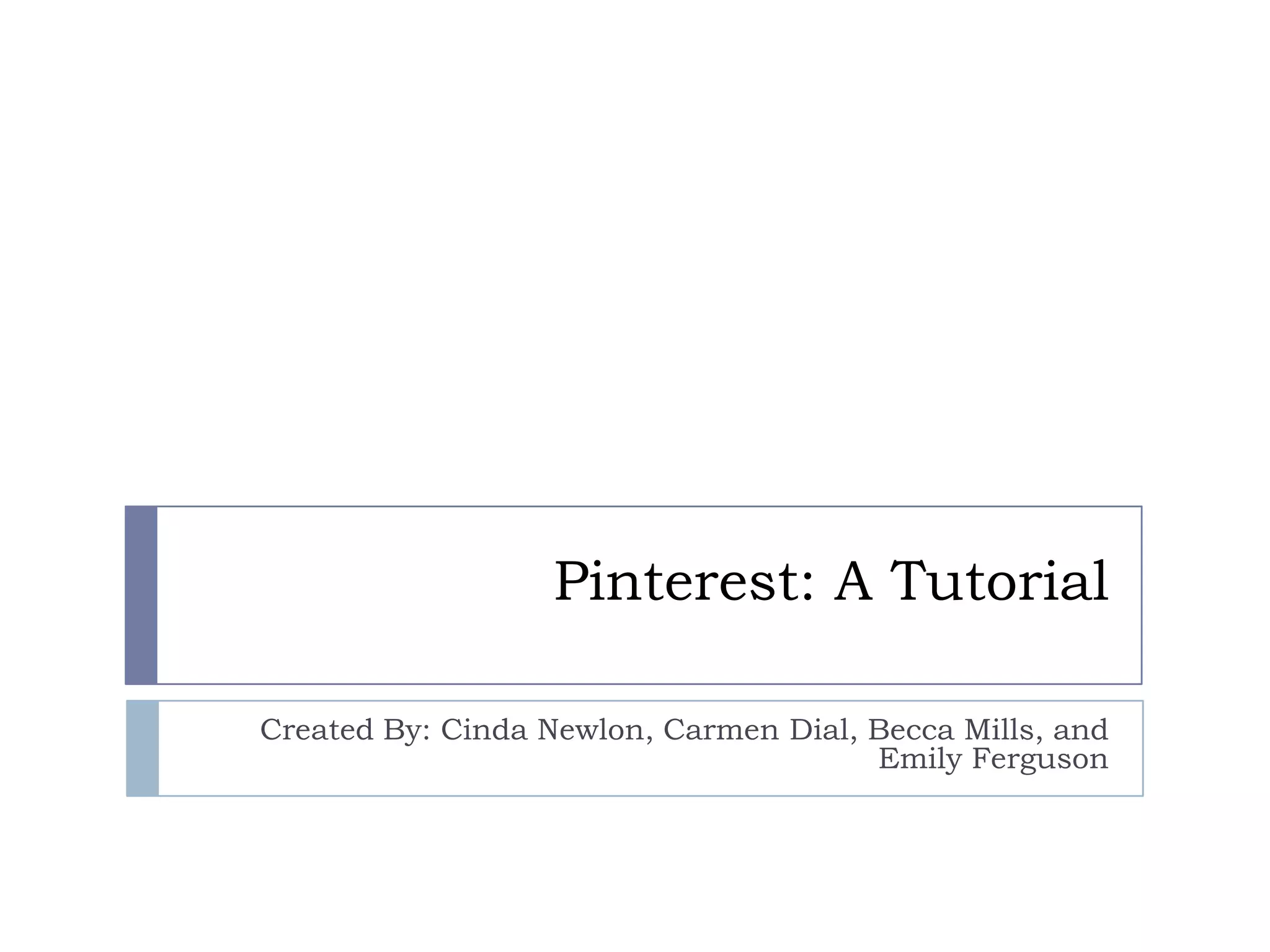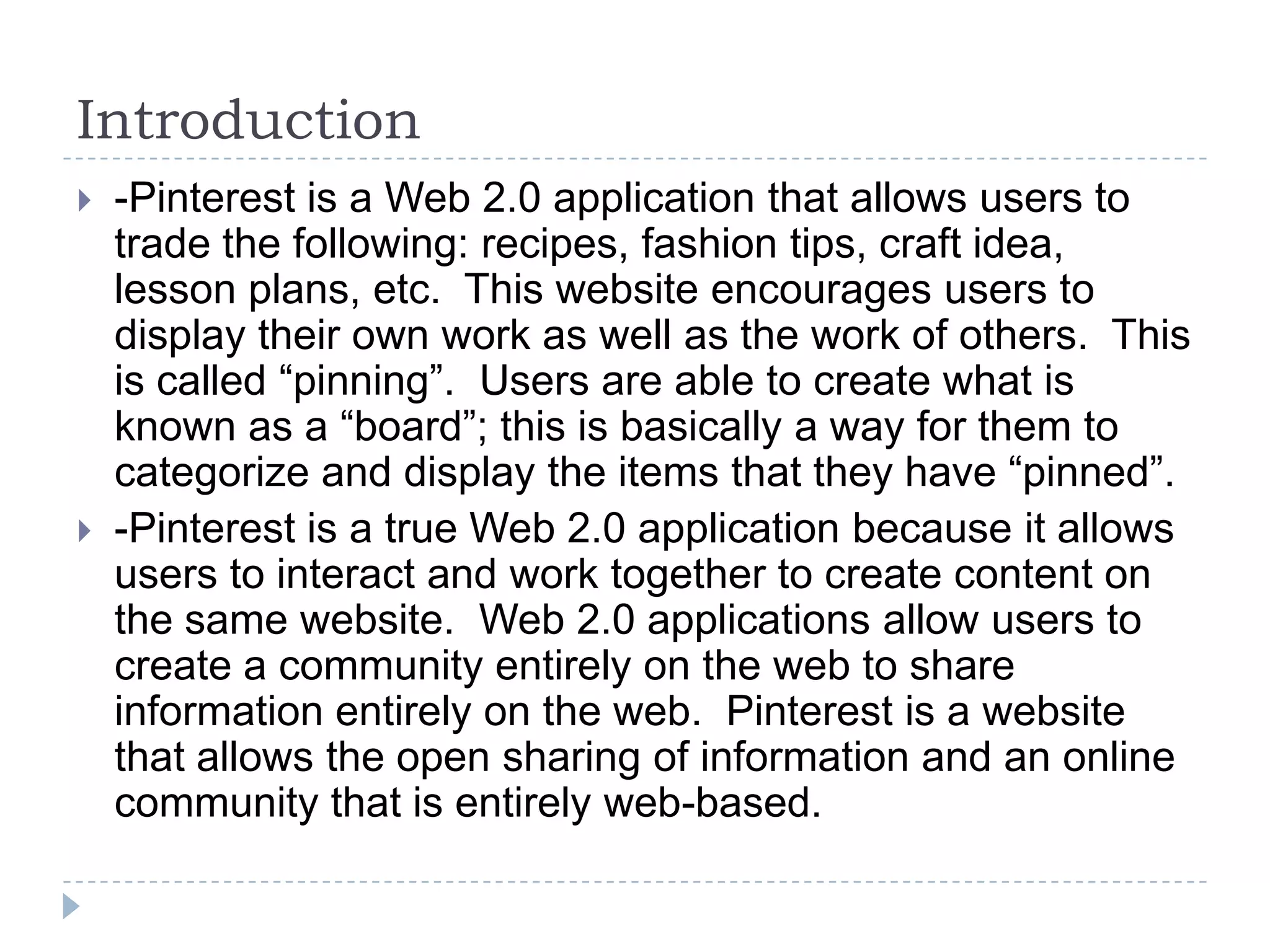 Pinterest is a social media application that allows users to create boards to organize and share items they find online, called pins. Users can pin recipes, crafts, fashion tips, and other content and categorize them into boards. It functions as a web-based community for open sharing of information. In education, Pinterest can be used to create class boards where students can explore topics and share findings with each other. Students can compile research on topics and pin information for other students to access conveniently without using class time. The tutorial explains how to sign up for Pinterest using Facebook for networking, create boards to organize bookmarks, and share pins and boards with others.