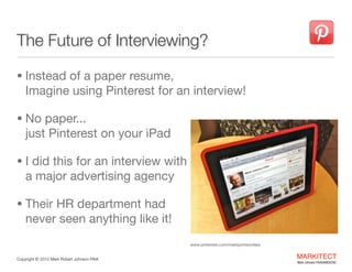 The document discusses the innovative use of Pinterest as a digital resume in the architecture, engineering, and construction industry, emphasizing its interactive and engaging format. It outlines the creation of a Pinterest profile with categorized boards showcasing work, social media presence, and professional achievements. The author shares experiences from using this approach in interviews, highlighting its effectiveness compared to traditional paper resumes.