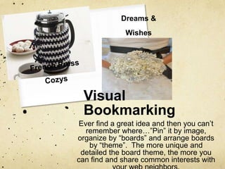 Virtual pinboard to organize and share images discovered on the web. Users can "pin" images to create visual "boards" organized by theme. Pinned images link back to original source. Users can pin, repin, follow boards, comment and engage with each other. Pinterest has apps and mobile access. It grew very quickly, popular among certain demographics. Organizations use it to highlight products and causes while linking back to their own sites. Analytics tools track pins and influence. National Wildlife Federation curates boards with range of tones to inspire and inform about wildlife.