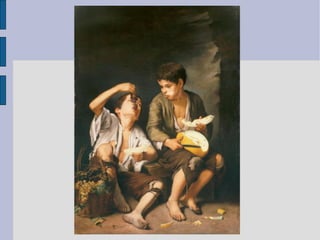 DOCUMENTACIÓ GENERAL: TÍTOL: Nens menjant raïm i meló (Dos nens menjant fruita) AUTOR : B. Esteban Murillo (1617-1682) CRONOLOGIA : 1650 ESTIL : Barroc espanyol TÈCNICA : oli SUPORT : tela; 1,45 mts (alt); 1,06 mts (llarg) LOCALITZACIÓ ACTUAL : Alte Pinakothek, Munic TEMA : dos nens al carrer menjant fruita