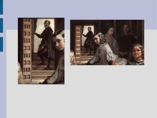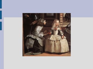DOCUMENTACIÓ GENERAL: TÍTOL: Las Meninas AUTOR : Velázquez (1599-1660) CRONOLOGIA : 1656 ESTIL : Barroc espanyol TÈCNICA : oli SUPORT : tela; 3,18 mts (alt); 2,67 mts (llarg) LOCALITZACIÓ ACTUAL : Museu del Prado, Madrid TEMA : retrat col.lectiu de la infanta Margarida. També retrat dels reis, reconeixement de l'artista...