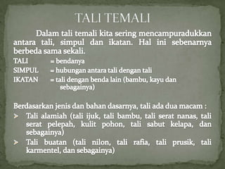 Dokumen ini menjelaskan tentang pioneering dalam pramuka, yang merupakan keterampilan penting untuk memanfaatkan barang-barang alam menjadi alat yang berguna. Terdapat berbagai jenis simpul dan ikatan yang digunakan dalam kegiatan pramuka, masing-masing memiliki fungsi spesifik untuk mendukung kegiatan luar ruang. Pramuka diharapkan untuk rajin, terampil, dan memiliki sikap bersahaja dalam melaksanakan tugas mereka.