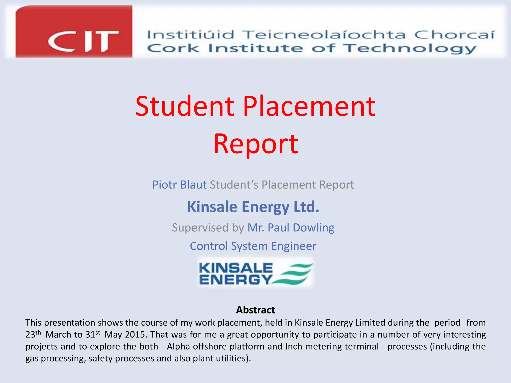 Piotr Blaut completed a work placement with Kinsale Energy Ltd from March to May 2015. He gained experience working on offshore platforms and projects. Some of the projects he assisted with included upgrading the glycol regeneration system by replacing old valves and instruments, updating the fire and gas detection system by inspecting detectors and modifying drawings, and adjusting flame detectors' fields of vision to improve safety coverage. The placement provided opportunities for Piotr to learn about offshore gas production and safety processes.