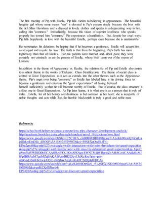 Pip undergoes major transformations throughout Great Expectations as he interacts with different characters from varying social classes. At the beginning and end of the novel, Pip's moral values remain largely the same, but during his maturation he struggles to find his place in society. The two most influential figures in his life are Estella, who represents Miss Havisham's revenge against men, and Magwitch, the convict who becomes Pip's secret benefactor. Pip's interactions with characters from different backgrounds teach him to discern right from wrong and choose worthy role models.