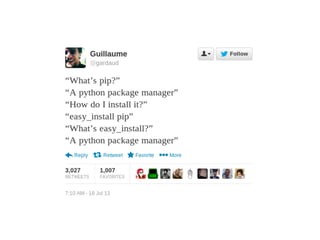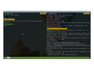 Pip is a tool for installing and managing Python packages. Virtualenv allows creating isolated Python environments and avoids system-wide installations of packages. It is recommended to create a separate virtualenv for each project to isolate packages and versions. Key commands include mkvirtualenv to create, workon to activate, pip to install/uninstall packages, and deactivate to exit a virtualenv. Virtualenvwrapper makes working with virtualenv easier. Environment variables can be set on virtualenv activation to configure database credentials for each isolated project environment.