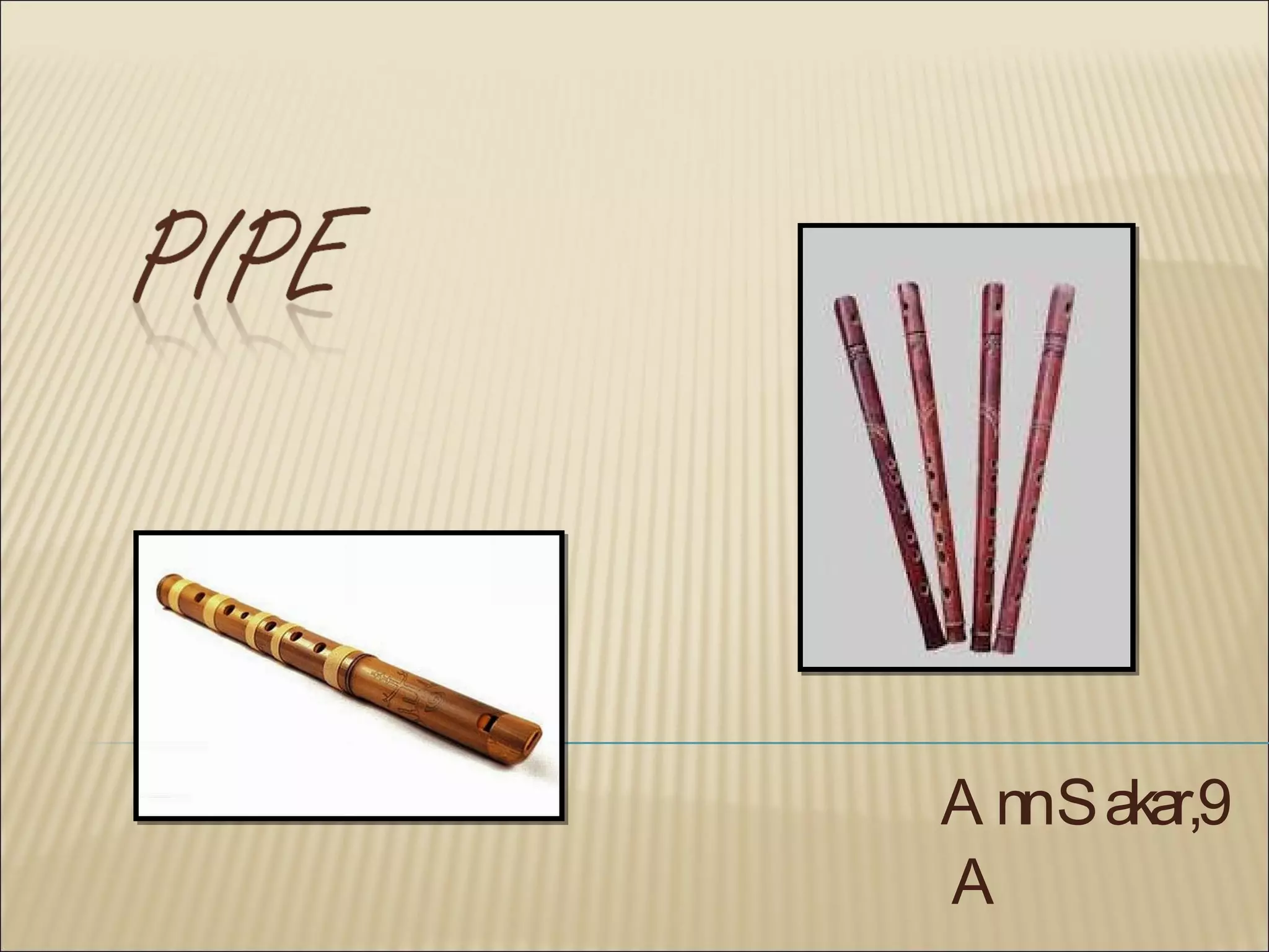 The pipe is a Russian double-barreled wind instrument originally from Ancient Greece. It consists of seven connected reed tubes of different lengths and was invented by Hermes according to Greek mythology. The pipe is made of three types of wood and has a hollow core with 4 to 8 cut apertures along its length, making it a double-barreled longitudinal flute. It is used as both an orchestral and solo instrument.