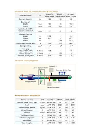 This document discusses a 3-layer anti-corrosion pipe coating system used to protect steel pipes. It describes the requirements and functions of each layer - the inner epoxy primer layer provides corrosion protection and bonding, the adhesive tie layer firmly attaches the outer layer, and the outer polyethylene topcoat provides mechanical and functional protection. The key to the system is the strong bonding between layers over a wide temperature range. The document also provides details on SK Corporation's polyolefinic adhesive and topcoat materials that have been effectively used for this application, and quality control processes for these materials.