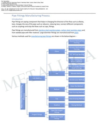 The document outlines the manufacturing processes of various pipe fittings, including elbows, tees, reducers, caps, and forged fittings, detailing methods like mandrel bending, extrusion, and hot forming. It emphasizes Metallica's capabilities in producing high-quality fittings from seamless and welded pipes, highlighting their expertise in various material grades and manufacturing techniques. Additionally, the document lists the types of fittings produced and invites potential customers to inquire for prices and details.
