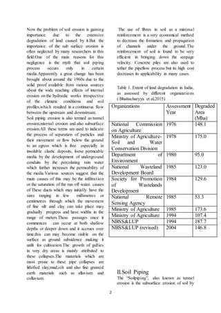 Land degradation in India affects around 147 million hectares, primarily due to water erosion, with significant impacts on agriculture which employs half of the workforce. Soil piping, or tunnel erosion, is a critical but often neglected aspect of soil degradation, leading to subsurface erosion and potential land unfitness for cultivation. Mitigation strategies must emphasize sustainable agricultural practices and soil conservation to combat the increasing threat of land degradation exacerbated by climate change.