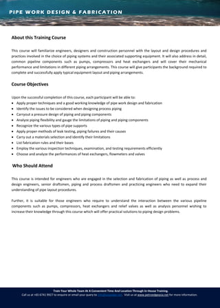 The document outlines a pipe work design and fabrication training course led by Dr. John L. Sproston, an expert with over 45 years of experience in the oil and gas industry. The course aims to equip engineers with the necessary knowledge and skills in piping design, insulation, and maintenance through comprehensive sessions covering various technical aspects. Participants will learn about plant layout, equipment performance, piping materials, and inspection techniques to effectively tackle piping design challenges.
