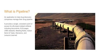 Pipeline is a web-based application for managing drug discovery projects and portfolios. It provides a single point of access for all project artifacts and allows users to visualize project status, teams, targets, documents, meetings, tasks, risks, issues, and lessons learned. The application can be used on desktops and mobile devices to manage data from any location.