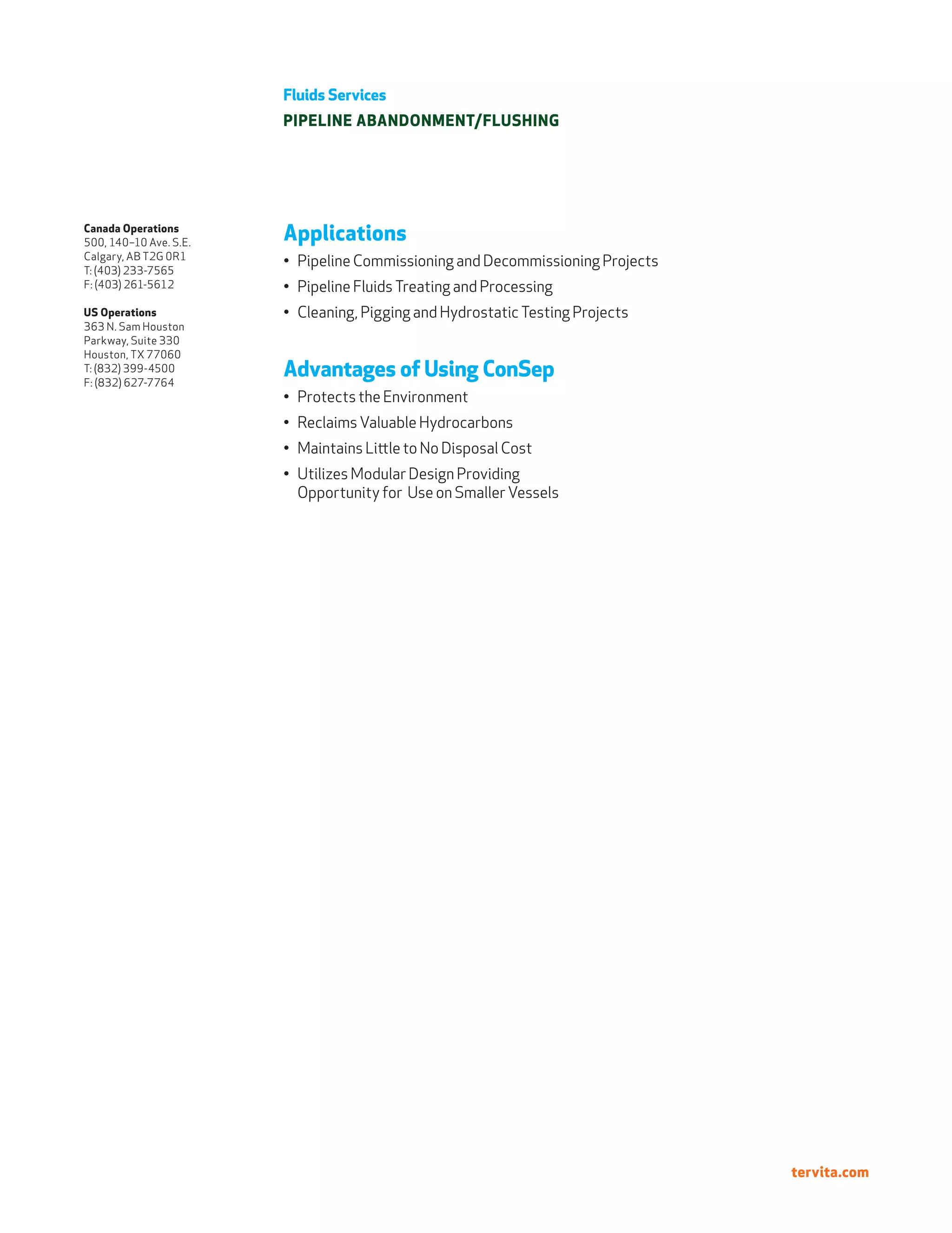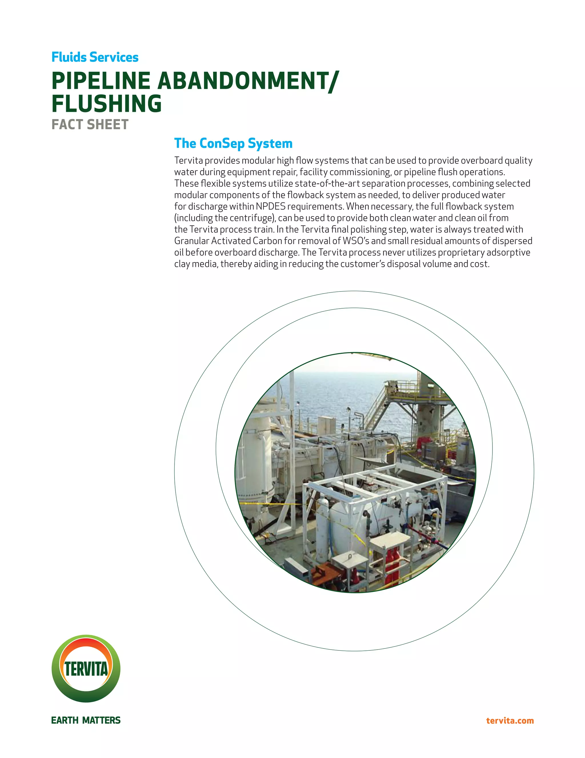 The document discusses Tervita's ConSep system, which uses modular components and state-of-the-art separation processes to provide clean water for discharge during pipeline flushing or equipment repair. The full system can deliver both clean water and clean oil. All water is treated with granular activated carbon to remove contaminants before overboard discharge, avoiding the use of proprietary clay media and reducing disposal costs. The ConSep system has applications in pipeline commissioning/decommissioning, fluids treating, and testing projects while protecting the environment and reclaiming hydrocarbons.