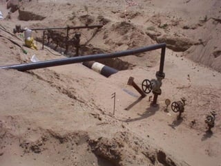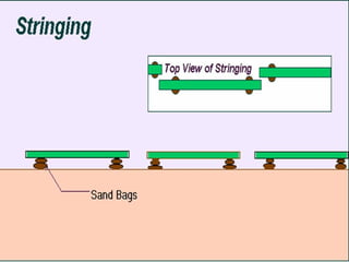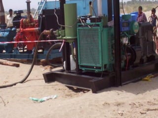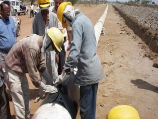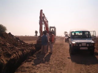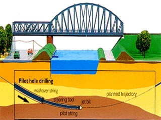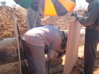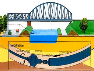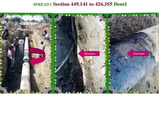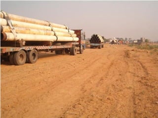 The document describes the procedures for pipeline construction. It involves activities like right of way clearing, trenching, pipe handling, stringing, bending, welding, coating of joints, lowering the pipeline into the trench, backfilling, and hydrotesting. Standard codes and quality checks are specified for each activity to ensure the pipeline is constructed safely and properly.