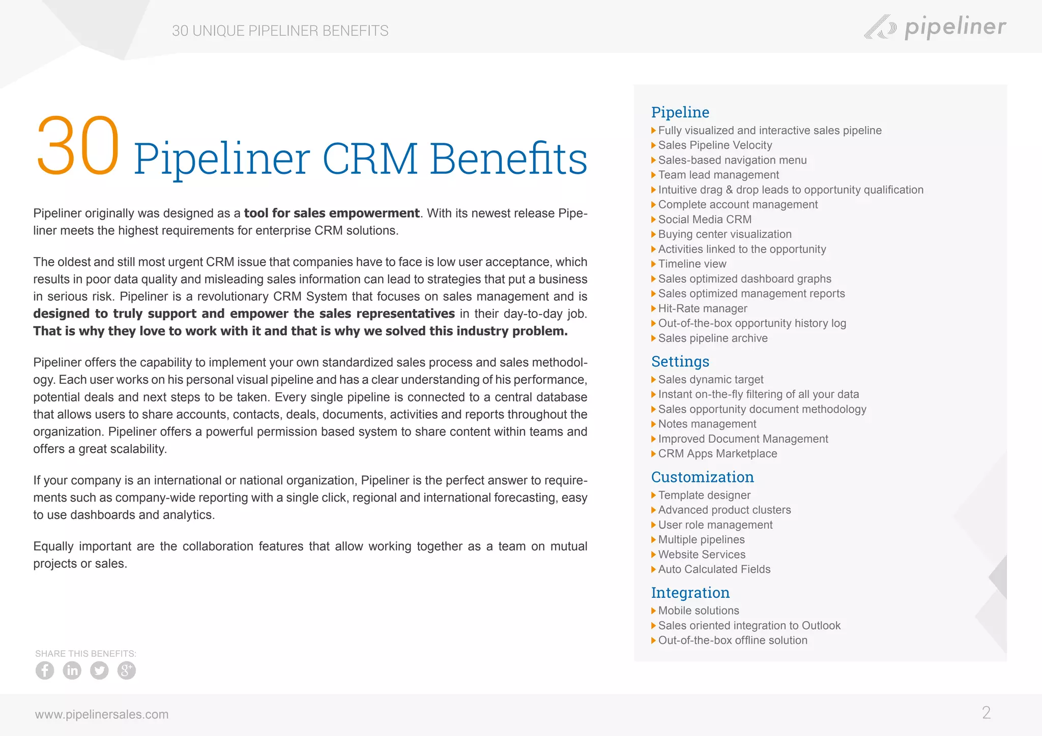 Pipeliner is a CRM system designed for sales teams that focuses on improving user acceptance. It offers various features to help sales teams manage opportunities in a visual pipeline, track performance, and collaborate. Some key benefits include fully visualized pipelines, account management features, social media integration, customizable forms and fields, mobile access, and integration with Outlook. The system aims to provide sales teams with the tools needed to work effectively and close more deals.