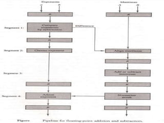The document discusses parallel processing and pipelining. It defines parallel processing as performing concurrent data processing to achieve faster execution. This can be done by having multiple ALUs that can execute instructions simultaneously. The document then discusses Flynn's classification of computer architectures based on instruction and data streams. It describes single instruction single data (SISD), multiple instruction single data (MISD), and multiple instruction multiple data (MIMD) architectures. The document then defines pipelining as decomposing processes into sub-operations that flow through pipeline stages. It provides examples of arithmetic and instruction pipelines, describing the stages in each.