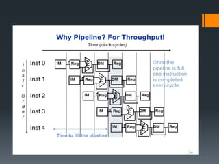 Pipelining is a technique used in advanced microprocessors allowing concurrent execution of multiple instructions across different stages, improving processing efficiency. It consists of stages such as instruction fetch, decode, execution, memory, and write back, enhancing throughput and performance. However, structural hazards may occur due to resource conflicts, which can be mitigated by stalling the pipeline or adding more hardware.
