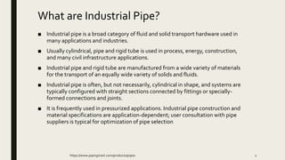 Industrial pipes are cylindrical transport systems used for fluids and solids across various industries, created from diverse materials tailored for specific applications. There are three main types of metal pipes: welded, seamless, and galvanized, each produced through unique manufacturing processes. The choice of pipe size and materials is critical, as they must withstand specific mechanical, thermal, and chemical stresses based on their intended use.