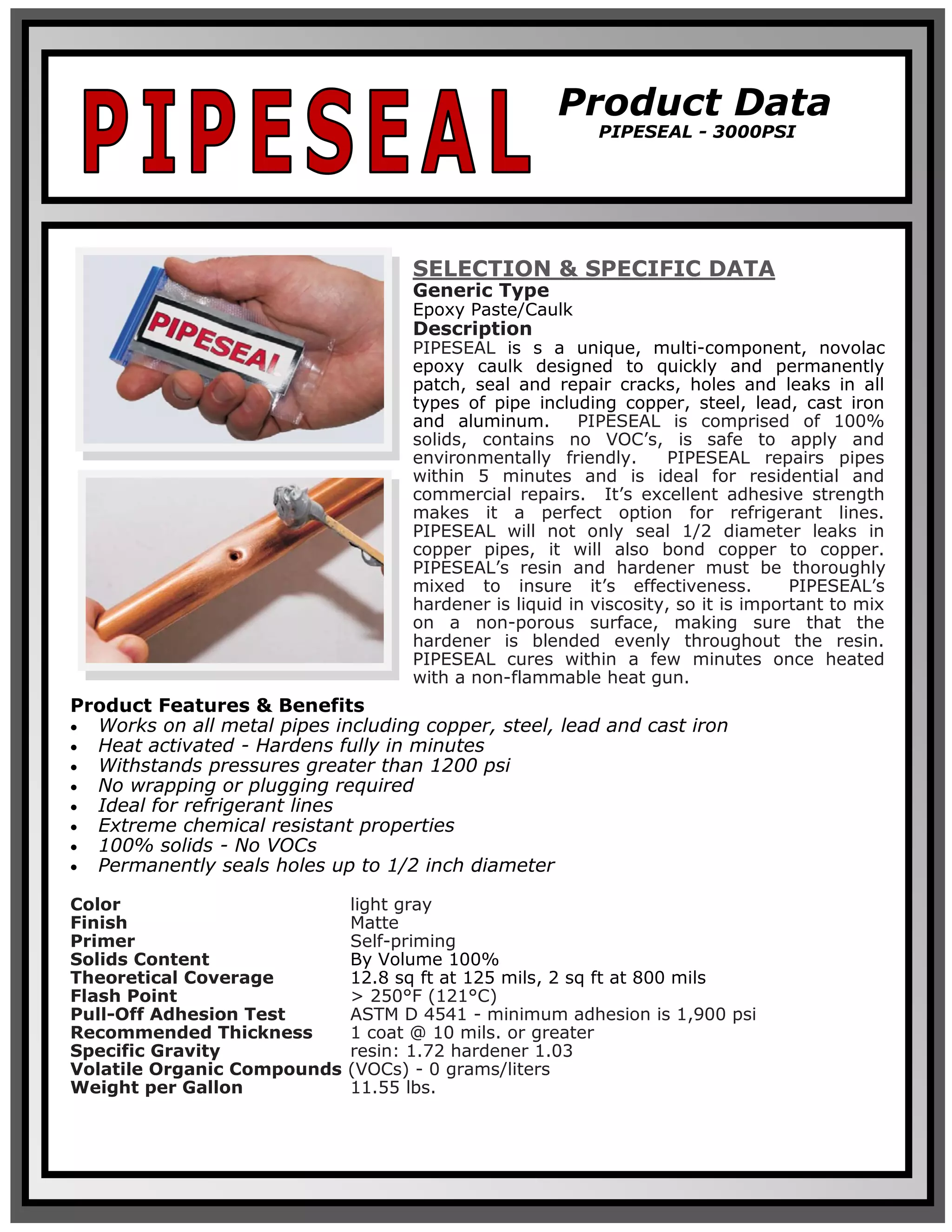 PIPESEAL is an epoxy paste designed to quickly seal cracks, holes, and leaks in pipes made of materials like copper, steel, lead, and cast iron. It hardens within 5 minutes when applied and heated with a heat gun. PIPESEAL is 100% solids with no VOCs, making it environmentally friendly. It can seal leaks up to 1/2 inch in diameter and withstand pressures over 1200 psi. To use, the resin and hardener must be thoroughly mixed together and applied to the leak, then heated to cure fully within minutes.