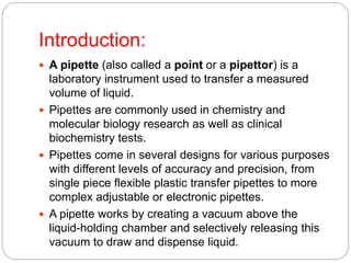This document explains the purpose, types, and safe use of pipettes, which are laboratory instruments used to transfer measured volumes of liquid. It describes various pipette types, including micropipettes, macro pipettes, auto-pipettes, and dispensers, along with their specific features and methods of use. Safety considerations emphasize that all plasma or serum samples should be treated as potentially infectious.