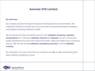 Amiante STR Limited specializes in the removal and management of asbestos materials, providing services such as surveying, encapsulation, and disposal to ensure safety and compliance. They recently undertook a project to remove approximately 70 meters of asbestos pipe lagging during a homeowner's refurbishment of a high-value flat. The company emphasizes health and safety, adhering to regulations and managing risks associated with asbestos exposure throughout their operations.