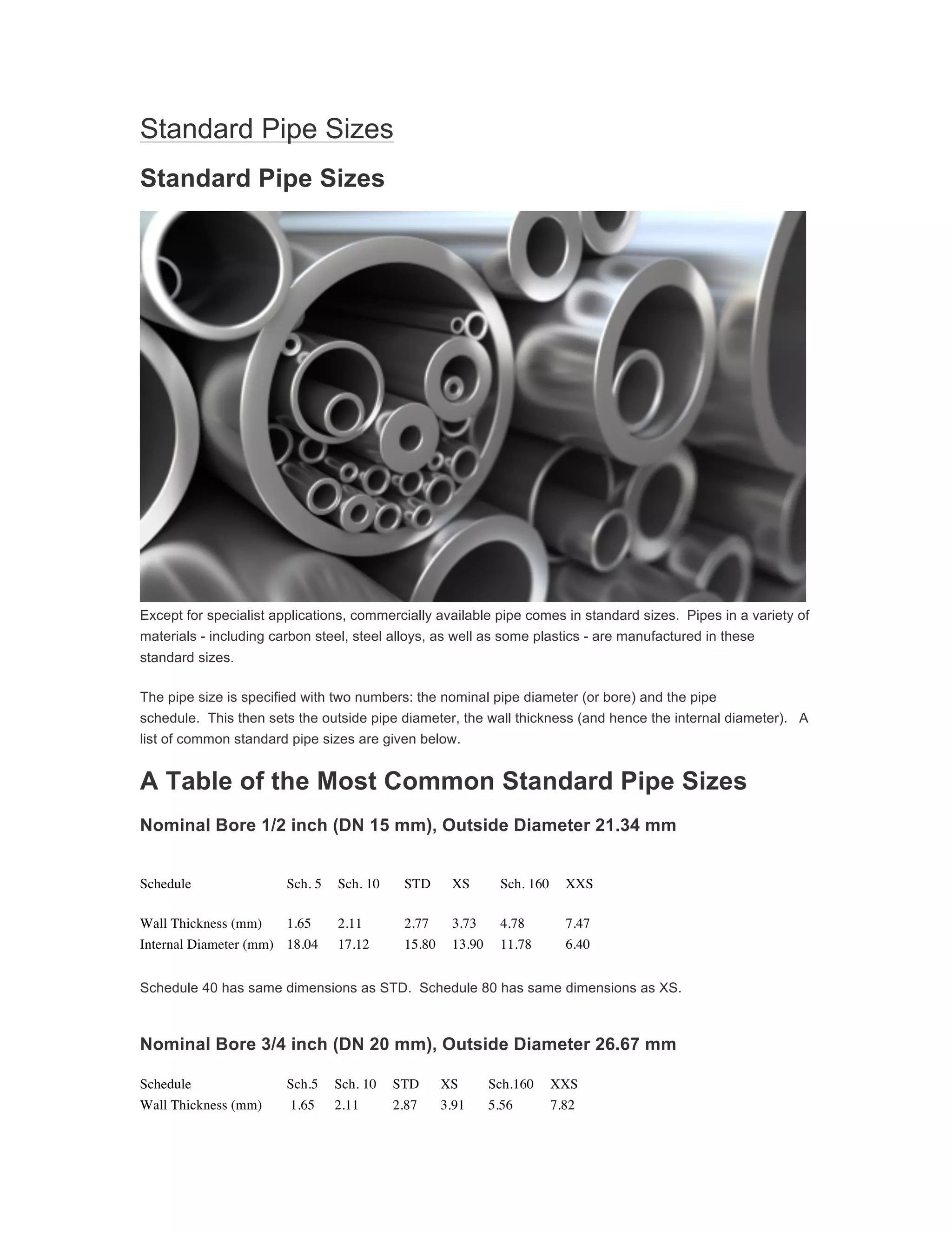 - Pipes come in standard sizes specified by nominal diameter and schedule, which set the outer diameter and wall thickness.