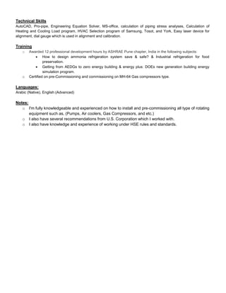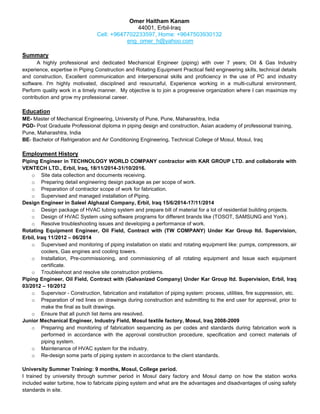 Omer Haitham Kanam is a highly professional and dedicated Mechanical Engineer with over 7 years of experience in the Oil & Gas Industry, specializing in piping construction and rotating equipment. He has expertise in practical field engineering skills, technical details, construction, and the use of industry software. His objective is to join a progressive organization where he can maximize his contribution and grow his career. He has a Master's degree in Mechanical Engineering and postgraduate diplomas in piping design and refrigeration engineering. His employment history includes positions as a Piping Engineer, Design Engineer, and Rotating Equipment Engineer on oil field projects in Iraq.