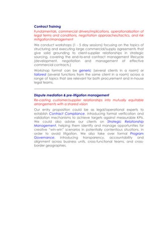 This document provides information on the services offered by Progressive Intelligence Partners, a global strategy and operations consultancy. It lists their addresses and contact information in the US, UK, and India. The document then summarizes their main service offerings, which include trusted advisory, program management, management development, business transformation, executive governance, commercial deal structures, contract training, dispute mediation, and strategic relationship management.