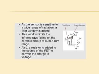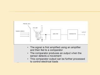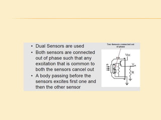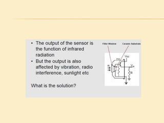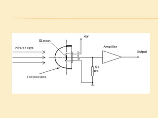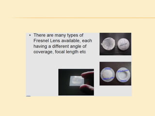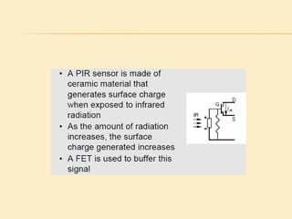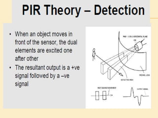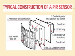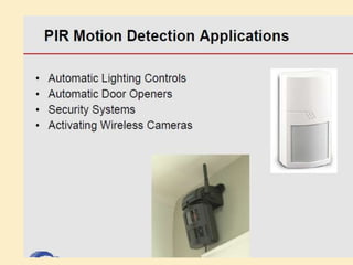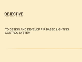 This project presentation summarizes the design and development of a PIR-based lighting control system. The system uses a PIR sensor to detect motion and trigger lights. When no motion is detected, the lights will turn off to save energy. PIR sensors detect infrared radiation emitted from surrounding objects and can be used to control lights in areas that only require occasional illumination, such as pathways, driveways, and gardens. The presentation provides details on PIR sensor components and working, the application circuit design including a power supply, sensor interface, microcontroller, and relay to control lights. It explains how the system can be used to automatically turn lights on when motion is detected and off again after a period of inactivity to provide energy-