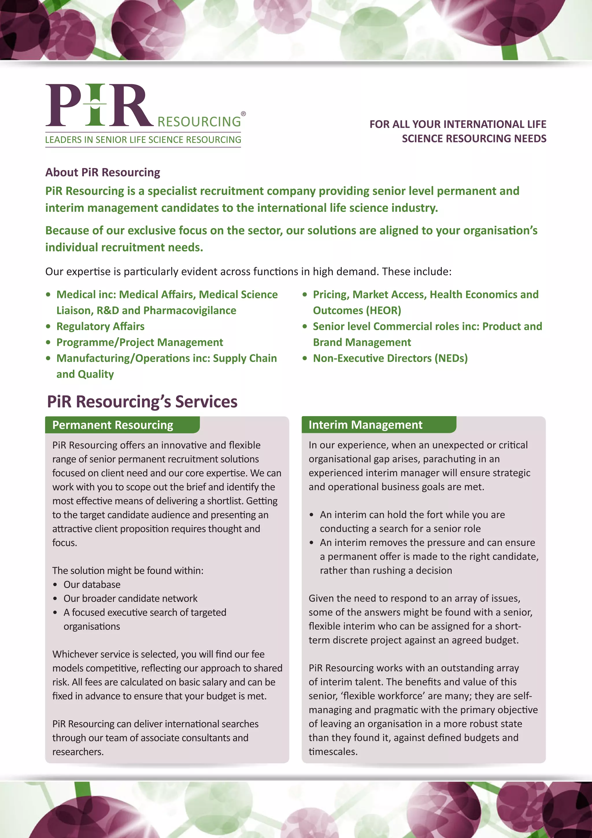 PiR Resourcing is a specialist recruitment company that provides senior level permanent and interim candidates to the international life science industry. They offer services including permanent resourcing, interim management, talent mapping, bioscience non-executive directors, and board evaluation/HR consulting. Their expertise includes roles in medical, regulatory, commercial, manufacturing, and other key life science functions.