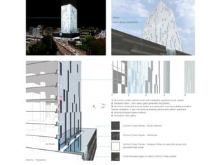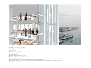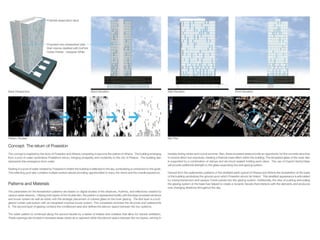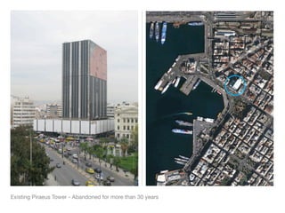 The document proposes a design for redeveloping the abandoned Piraeus Tower in Greece into a mixed-use development with outdoor dining plazas overlooking the Port of Piraeus and featuring a waterfall entry and beacon.