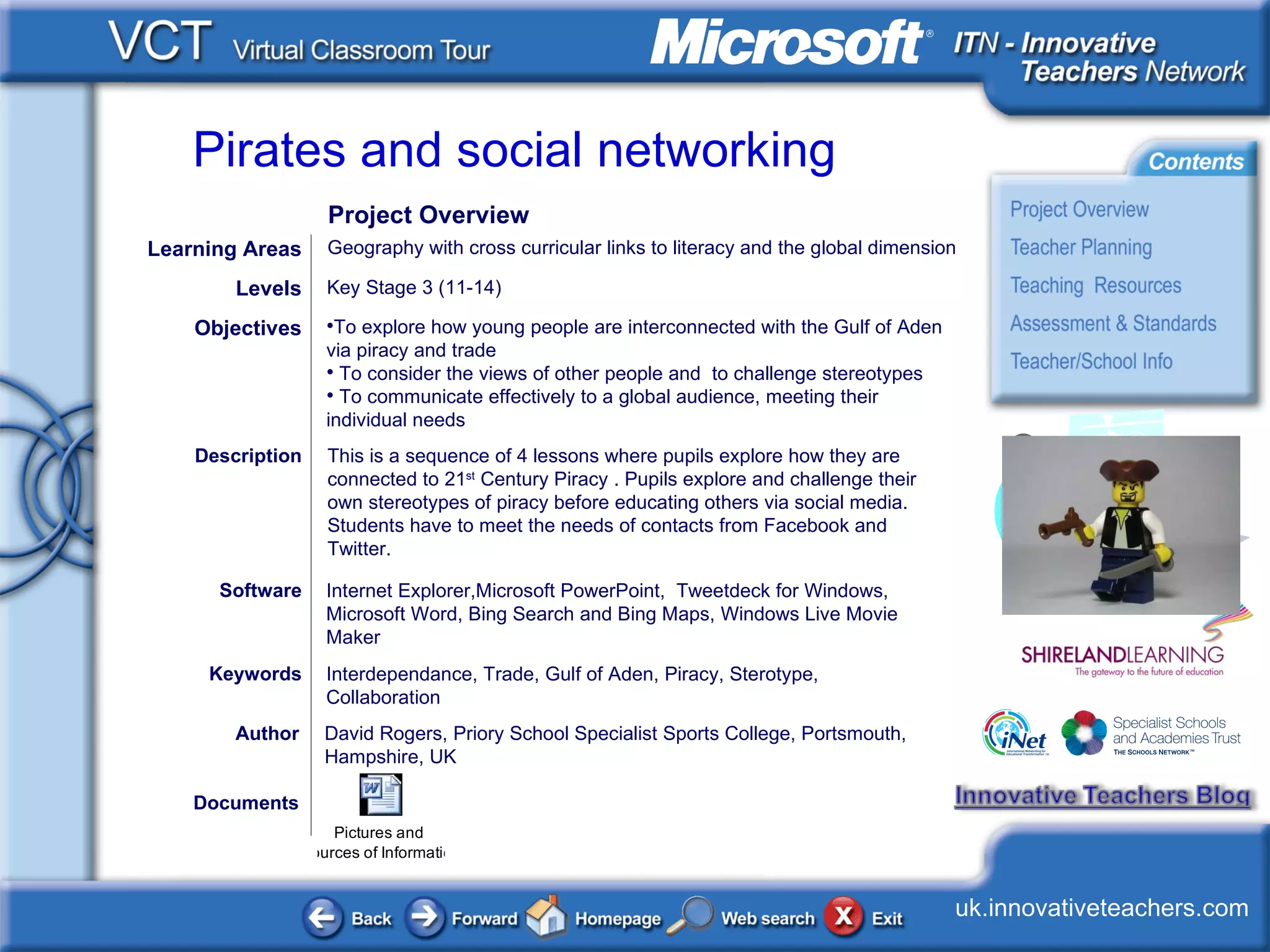 The document outlines a series of lessons by David Rogers at Priory School that engage students in exploring piracy and trade related to the Gulf of Aden. It emphasizes challenging stereotypes through social media interaction and developing effective communication skills. The project integrates geography and literacy for students in Key Stage 3, providing resources and assessments to enhance learning.