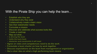 The document outlines a workshop format called the 'pirate ship', designed to help teams develop into high-performing units through playful and collaborative activities. Utilizing a pirate ship metaphor, it guides participants in establishing team identity, vision, mission, and stakeholder needs, while employing facilitation techniques from various sources. The workshop encourages teams to reflect on their strengths, weaknesses, and shared goals, ultimately leading to the creation of an improvement backlog for ongoing development.