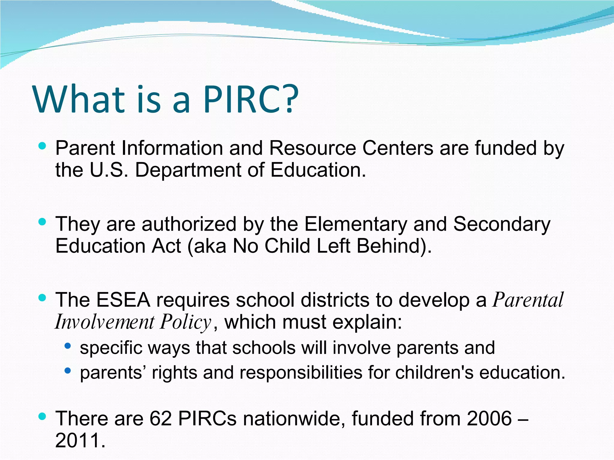 The document discusses Parent Information and Resource Centers (PIRCs) funded by the U.S. Department of Education to develop parental involvement policies required by the ESEA. In New York, there are two PIRCs: EPIC, which serves multiple urban areas, and FACTS, which covers northern New York. The PIRCs aim to engage families in closing the achievement gap and are supported by action teams that conduct research to recommend strategies for enhancing family engagement in education.