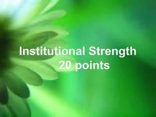 2. Institutional strength is evaluated based on the level of institutional capital, adequacy of provisions for probable losses on past due accounts, and capital participation levels.